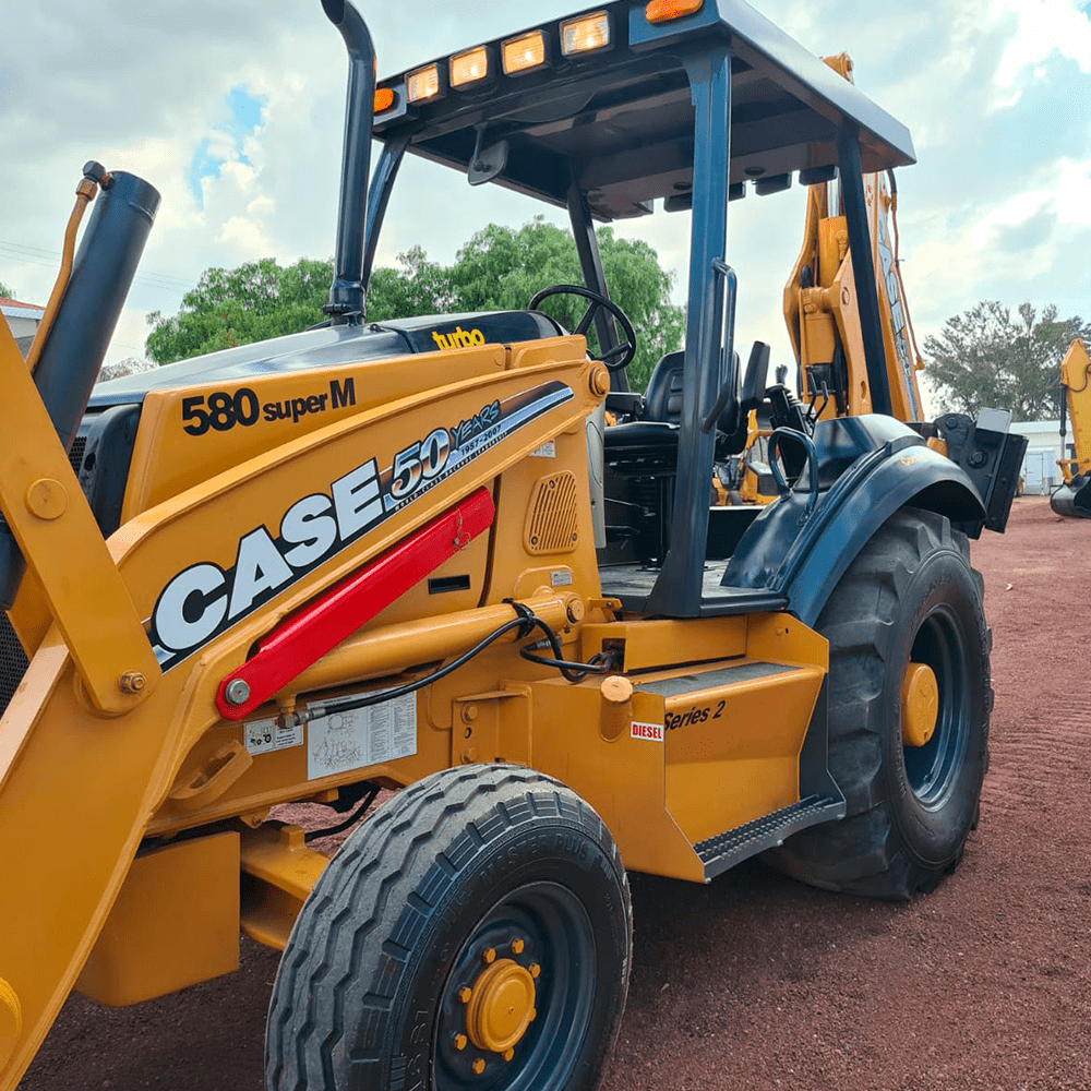 Retroexcavadora CASE 580 M Series 2, peso operativo de hasta 7.5 toneladas, potencia de 80 HP, cucharón de hasta 0.96 m³ (versión 4-in-1) y profundidad de excavación de hasta 4 m.